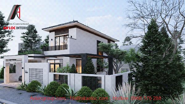 Thiết kế biệt thự 250m2 2 tầng sở hữu 2 mặt tiền giúp căn nhà có tầm nhìn rộng mở, ấn tượng. Xung quanh các mặt tiền đều được phủ màu xanh tự nhiên mang lại không gian thoải mái, nhẹ nhàng. Màu trắng pha trộng với tông đen – xanh tạo sự tương phản ấn tượng.
