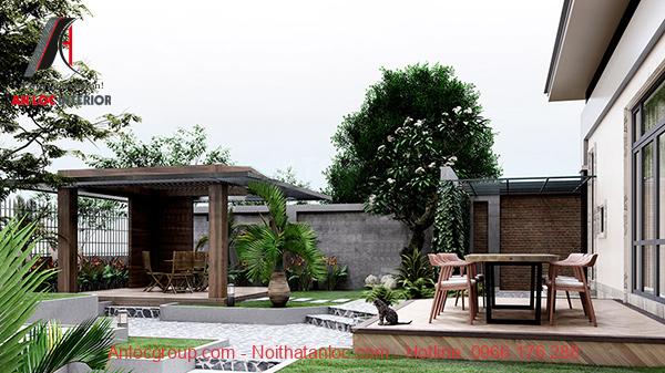 Tiểu cảnh biệt thự vườn 250m2 tạo nên không gian thư giãn thoải mái, tuyệt vời. Gia chủ khéo léo bố trí lán thông thoáng làm từ chất liệu gỗ tạo nên môi trường yên tĩnh, sảng khoái. Gia chủ có thể thưởng trà, ngồi ngắm cảnh quan sân vườn tạo nên không gian sống thoải mái, dễ chịu.